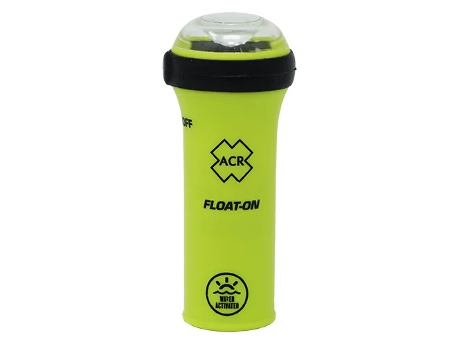 The ACR Float-On is a buoyant water activated strobe and LED flashlight. The strobe automatically activates in water when its integrated water sensors detect six seconds of water connection. The separated and sunken water connection terminals ensure the device only automatically activates when fully submerged in water. The high-power LED strobe, visible up to 3 nautical miles away, flashes once every second for up to 20 hours and acts as an exceptional safety aid for both novice and experienced boaters.