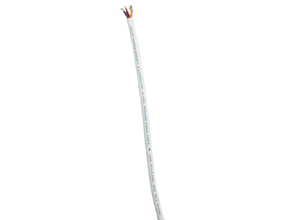 Ancor round signal cable features black, red, green, blue, brown, orange, purple and yellow Marine Grade primary conductors (correctly color-coded to ABYC standards) in a white common jacket that is made for easy removal while providing the best abrasion resistance available. These cables exceed UL 1426 standards and are made from the highest quality ultra flexible (Type 3/Class K) tinned copper stranding that provides maximum protection against corrosion and electrolysis while resisting fatigue due to vibration and flexing. The premium vinyl insulation is rated at 600 volts, 105 deg C dry and 75 deg C wet, stays flexible even in extreme cold (-40 deg F/C) and resists salt water, battery acid, oil, gasoline, heat, abrasion and ultra-violet radiation.