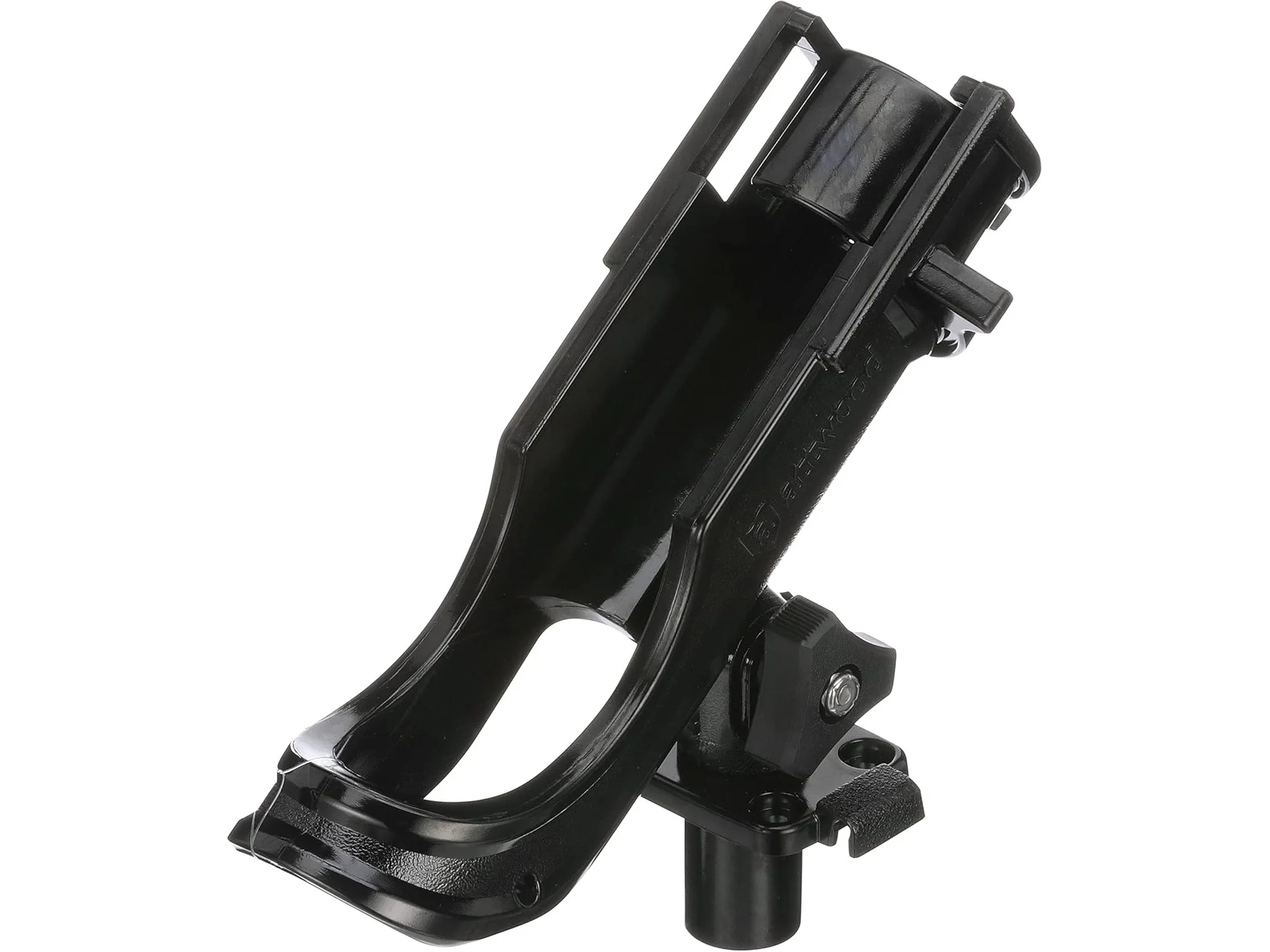 This Attwood Heavy-Duty Adjustable Rod Holder securely holds a fishing rod while fishing and offers easy-to-control vertical adjustability. This black Rod Holder is designed for use with bait casting and spinning reels. Loosen the large, easy-to-grip lock-nut to set the holder at the desired position across a 180-degree vertical adjustment range. This lets you set the rod tip height precisely as desired. This Rod Holder features an ergonomic design and easy-to-find rapid-release latch. It mounts flush to the surface.