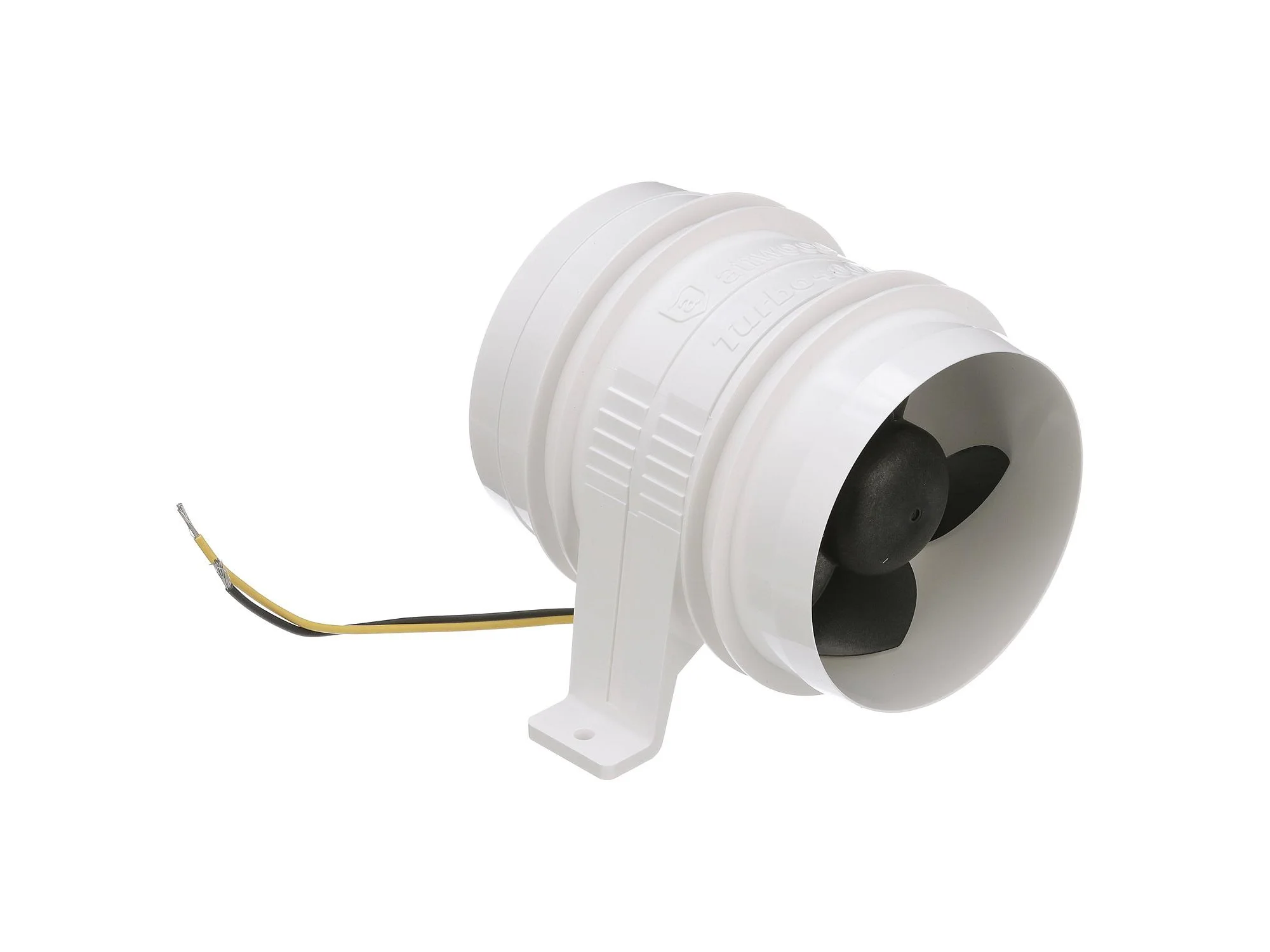 This Attwood Turbo 4000 Series II In-Line Blower provides outstanding ventilation airflow for areas such as engine compartments, galleys, bilges, and heads. It features a patented, in-line design and the 5-blade fan maximizes airflow and efficiency. The blade sweep and pitch are engineered for a high lift coefficient, which results in increased airflow speed for optimized ventilation. It matches the airflow of competitive in-line blowers with significantly reduced noise output. For added durability, it has an engineered plastic housing that resists deformation during installation, and prevents blade-to-housing interference. No other bilge blowers in the industry provide such powerful system output at such low power input in a compact size. System airflow exceeds older-style in-line blowers by as much as 25 percent. It is also up to four times more efficient than competitive blowers as it draws up to 40 percent fewer amps. This blower is marine ignition protected and has built-in mounting feet that permit easy vertical or horizontal installation. This 12-volt, water-resistant white blower is intended for use with 4-inch interior diameter ventilation hose. It installs with #10 fasteners.