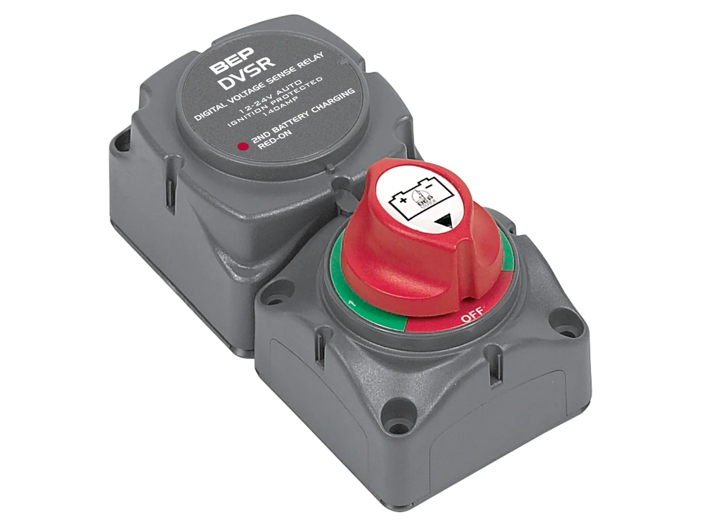 The 714-140A-DVSR uses a dual sensing DVSR (710-140A). This system ensures that you will always have a fully charged reserve battery. When the switch is in position one, battery one becomes the sensing battery for the VSR. Battery two, which is in isolation, is charged through the VSR when the engine is running to ensure that it is always fully charged. When the switch is in position two, battery two becomes the sensing battery and battery one is charged through the VSR. The fact that there is always a fully charged battery in reserve is a huge safety benefit.
