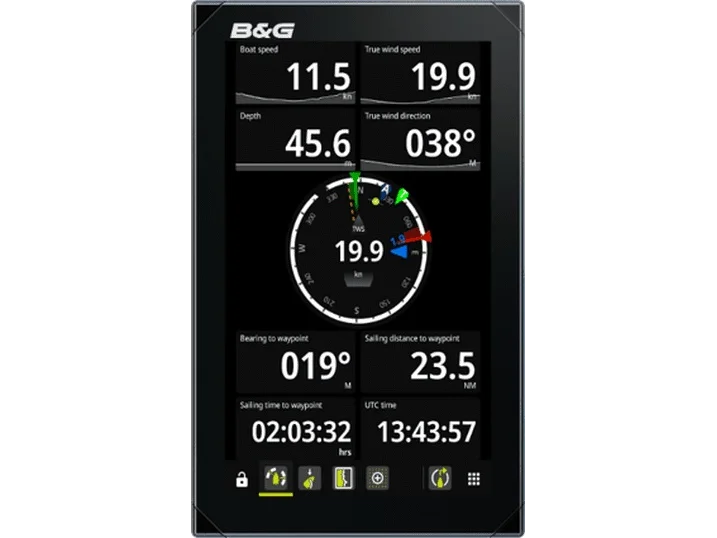 This all-in-one customization display can be mounted in either portrait or landscape. The easy to use drag & drop editor provides a wide choice of graphical gauges, SailSteer™, tank levels, digital data, IP camera views, histograms and images. With this, you have the freedom to select the data, visualization and set size and position that you want; or you can simply choose from a choice of pre-selected built-in B&G dashboards and templates. Additional automatic context modes* allow you to choose the sailing data you want to display based on your point of sail or sailing mode: Upwind, Reaching, Downwind, Pre-start or Motoring. (*Requires H5000 CPU)