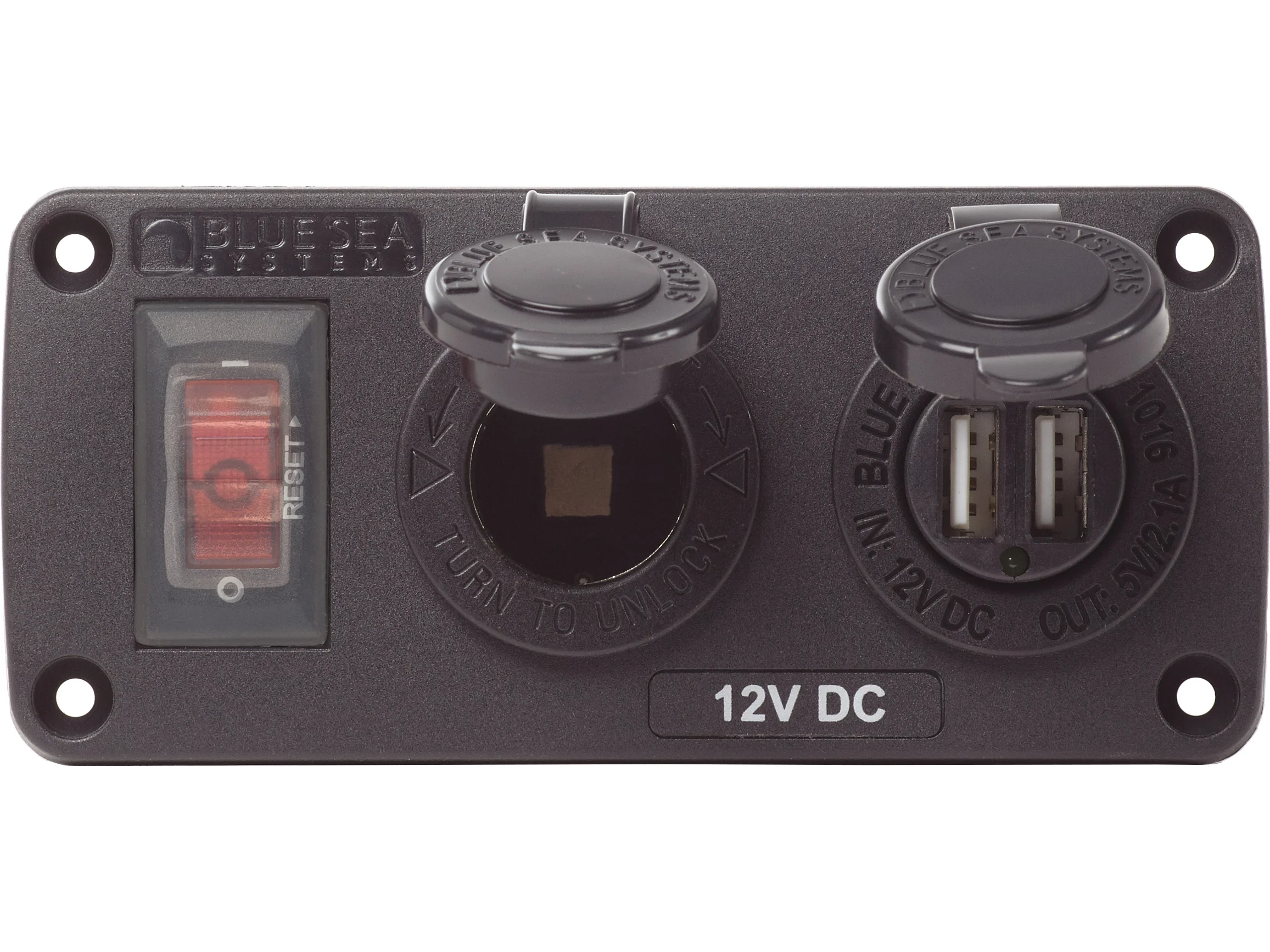 Blue Sea Systems Water-Resistant Accessory Panels – 15A Circuit Breaker, 12V Socket, 2.1A Dual USB Charger