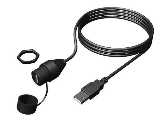 Panel Mount USB Connector with Waterproof Cap for use with MS-RA200, MS-RA205, MS-IP700I or MS-AV700I (to connect various smartphones, iPods or Flash Drives with MP3 files to head units, lower cost option to the Fusion Docks)