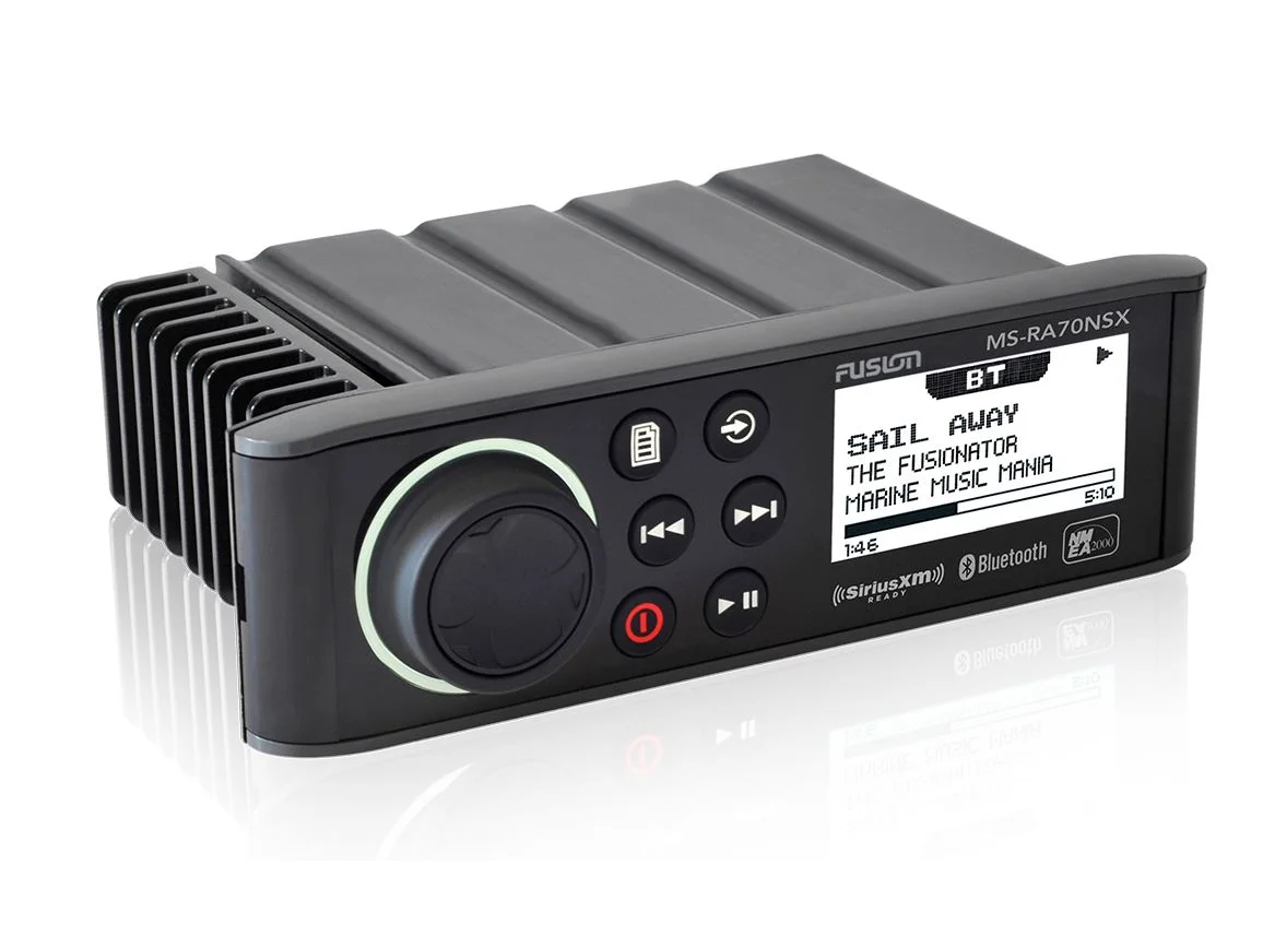 Introducing the MS-RA70NSX, Fusion’s sleekest value-packed marine stereo now with SiriusXM capability, designed to deliver a quality on-water entertainment experience by incorporating some of the latest marine technologies. The MS-RA70NSX is engineered to seamlessly replace any standard DIN sized non-marinized stereo without the need to reconfigure dash space. Clever styling gives the installer the option of either mounting the stereo with a conventional flush finish or integrating it flat into a glass helm, ensuring a high-end finish to the installation.