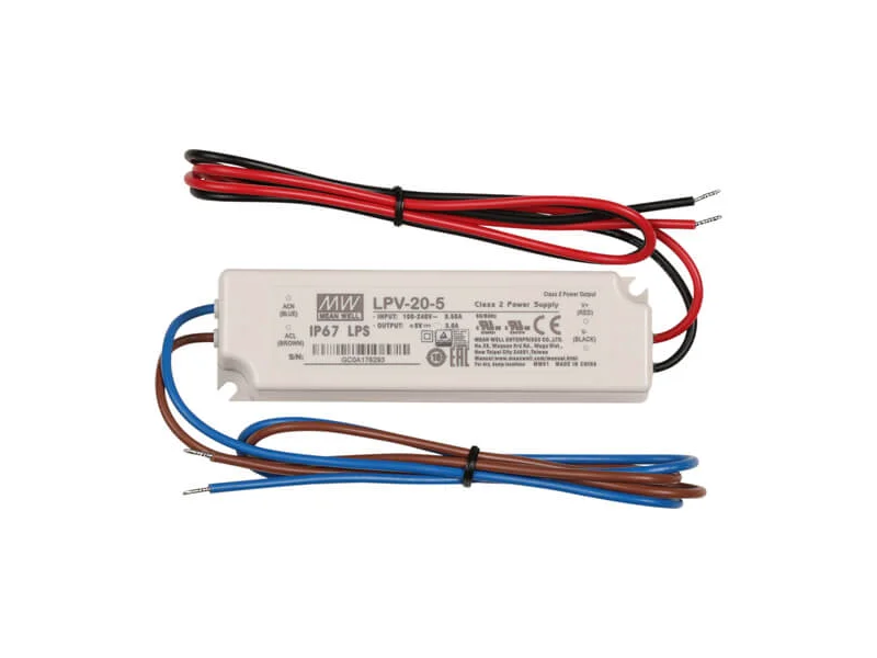 Choose the hard-wired option to connect directly into AC mains power without the need of an outlet plug. This hard-wired product works with 90-264 VAC input and has 5 VDC output voltage.