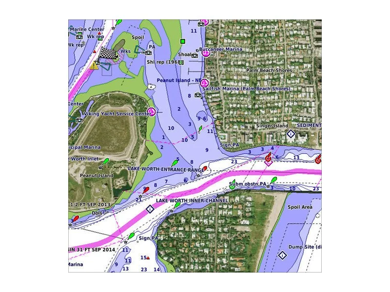 - Derived from official charts and private sources to provide navigational aids, spot soundings, depth contours, tides and currents, and detailed harbors and marinas