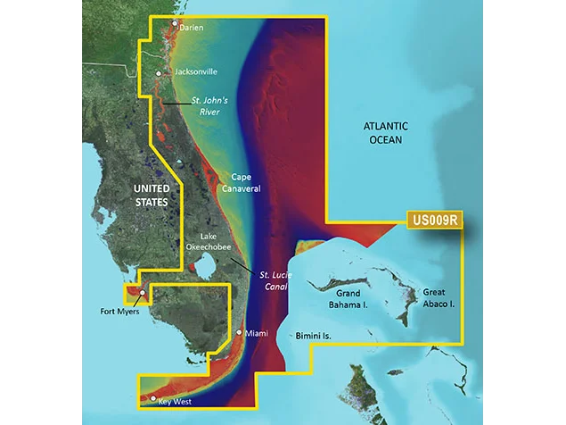 Darien, GA to Key West, FL including the entire St. John’s River, the St. Lucie Canal, Lake Okeechobee, with coverage over to Ft. Myers. Also includes detailed coverage of Bimini, the Abacos and Grand Bahama Island.