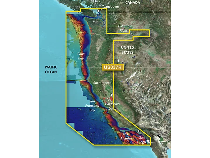 Detailed coverage of the west coast of North America from Vancouver, Can. to the U.S. border with Mexico. Detailed coverage includes Puget Sound, San Francisco Bay, San Diego Bay, the Columbia and Snake Rivers and the California Delta to Sacramento and Stockton.