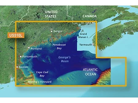 Detailed coverage the east coast of the U.S. and Canada from Cape Cod to St. John, NB, including Boston, MA, Portsmouth, NH, and Portland, ME, as well as the Kennebec R. to Augusta, ME and the Penobscot R. to Bangor, ME. Coverage also includes Martha’s Vineyard, Nantucket Island, Grand Manan Island, Mt. Desert Island, and Calais, ME as well as St. Mary’s Bay and Yarmouth, NS. Bathymetric coverage includes George’s Basin, Franklin Basin, and the Northeast Channel.