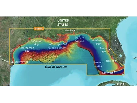 Detailed coverage of the Gulf of Mexico from Brownsville, TX to Plantation Key, FL including Corpus Christi, TX, Matagorda Bay, Galveston Bay, Port Arthur, TX, Atchafalaya Bay, the Mississippi Delta, Chandeleur Islands, Tampa Bay and the Florida Keys west of Key Largo. Also includes Lake Ponchartrain and Lake Maurepas to Vermilion Bay and Lake Calcasieu. Bathymetric coverage of offshore features from Northwest Slope to Tortugas Terrace including Keathley Canyon, Green Canyon, Orca Basin, Mississippi Canyon, Southwest Pass, DeSoto Canyon, Florida Middle Ground, Howell Hook, and Tortugas Bank.