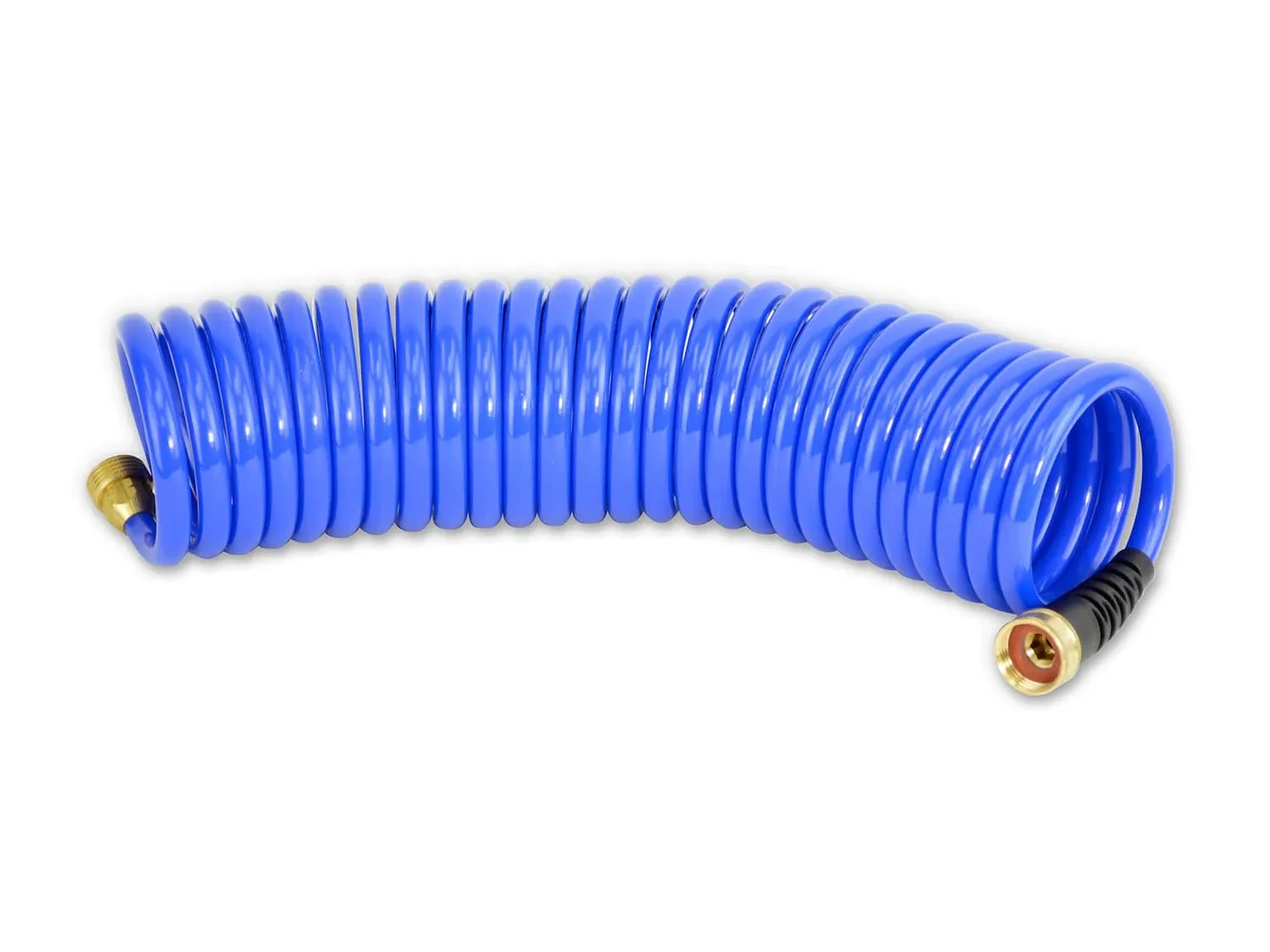 HoseCoil 25′ hoses are lightweight, self-coling hoses. The hoses are built with standard 3/4″ field serviceable soild brass fittings, and our newly upgraded (HP) high performance Polyether material. A HoseCoil hose is the the perfect solution for using and storing a hose.