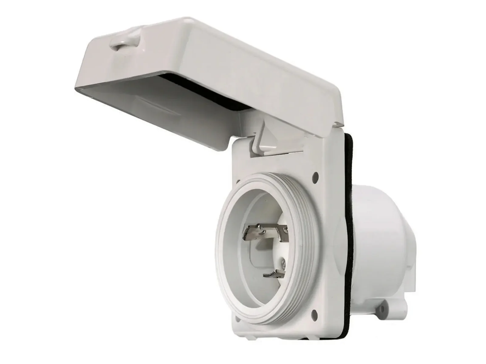 Stylized UV resistant non-metallic shore power inlet has white Centrex cover which makes unit weatherproof when completely closed. Interior has easy-to-wire terminations and is transparent for quick and easy visual inspection. Mounting holes are 23/8″ (60.3) on centers and match existing mounting patterns. Mounting screws and gasket included. Protective rear enclosure/strain relief also included.