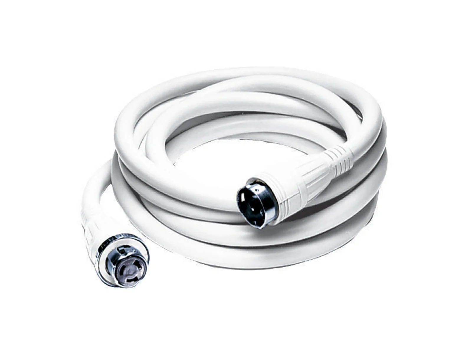 25′ (15.2m) white vinyl jacketed shore power cable set, #6 AWG type STOW is completely factory pre-wired with molded-on devices. The connector end has a metallic threaded sealing ring for making the inlet/connector interface watertight. IP56 SUITABILITY (BOATSIDE).