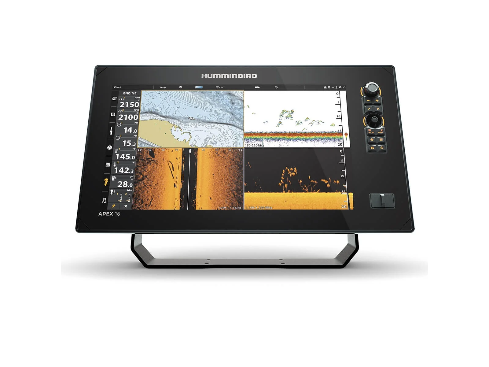 The APEX 16 MEGA SI+ CHARTPLOTTER CHO provides the clearest sonar imaging on the sharpest multi-function display that anglers have ever seen. Industry-leading MEGA Imaging+ and Dual Spectrum CHIRP sonar come standard, with even more performance from a dedicated sonar channel for accessory 2D CHIRP transducers up to 2kW. See it all clearly with a 15.6″ Full-HD touchscreen that provides a customized display of information from advanced network options like NMEA 2000®, HDMI In/Out, WiFi and Bluetooth®. Add the power of the One-Boat Network™ to integrate the accuracy of Humminbird GPS charts, unrivaled boat control from Minn Kota®, and reach new depths with wireless Cannon® downrigger control. The APEX Series is a new kind of MFD that will take you fishing to a new level. This CHO (Control Head Only) model is the perfect pairing for anglers looking to select their own transducer, such as a Stainless Steel thru-hull option (SSTH 14 HW MSI+) or simply to add an additional display to an existing Humminbird network.