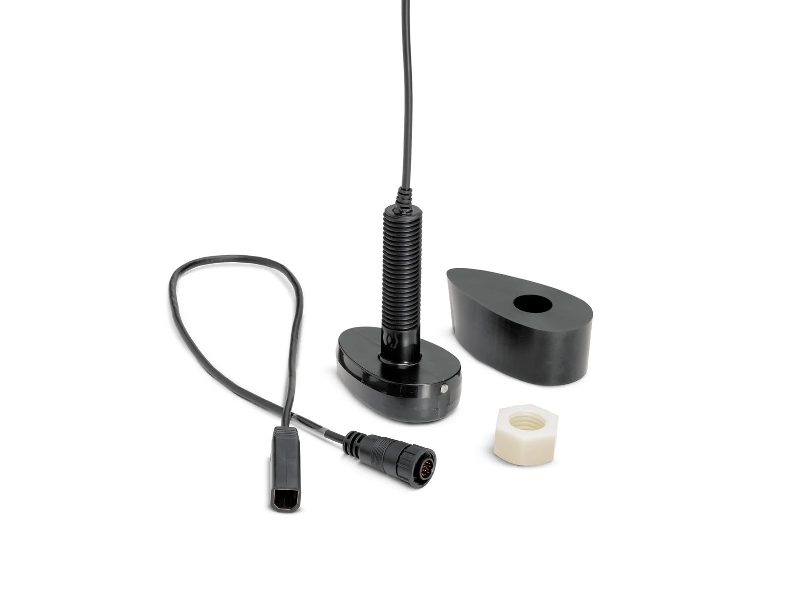 Plastic Thru-Hull Dual Spectrum CHIRP Transducer supports Dual Spectrum CHIRP 2D Sonar with high frequency beam and wide cone angle, offering CHIRP range of 150-220kHz and max depth of 1200ft. Includes built-in temperature sensor, rugged composite design and 30’ cable.