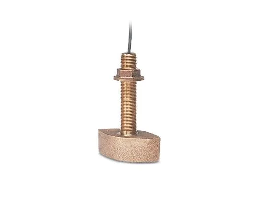Bronze thru-hull transducer, Single/Dual beam use. 20/60 degree, 200/83kHz. Transducer dimensions: 5.25L x 2.75"W x 1.2"D (below hull); Shaft diameter: 0.86". Fairing block not included.