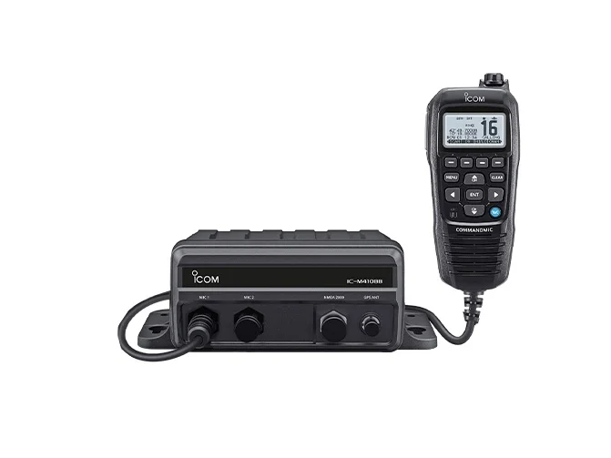 Icom’s M410BB is a flexible black box fixed mount that provides VHF communications for vessels with limited helm space. The supplied CommandMic™ controls the radio for essential communications on the water.