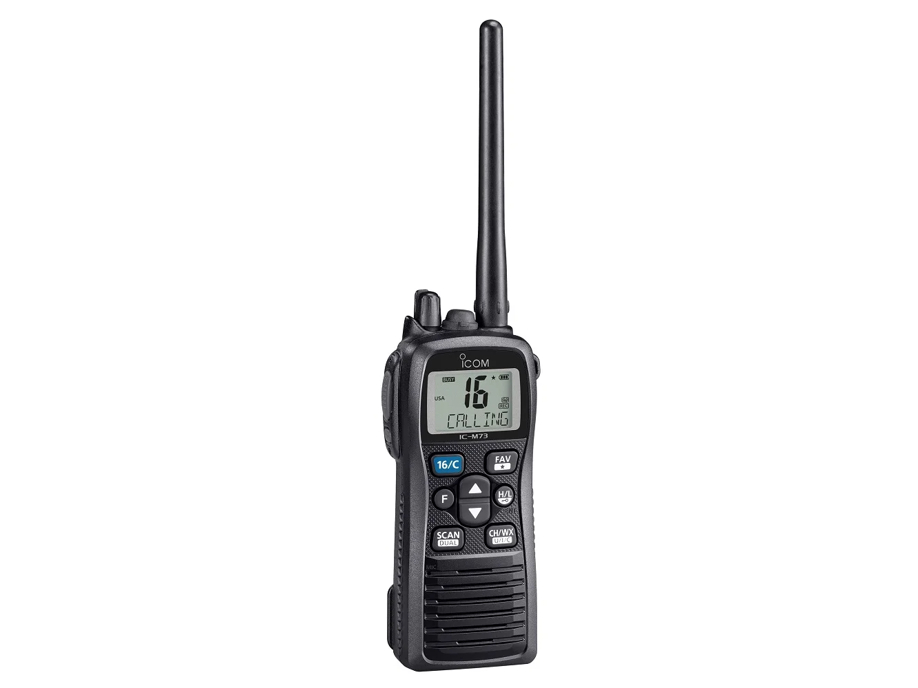 The M73’s ergonomic design fits easily in the user’s hand and is a rugged, durable radio. The large screen and high intensity LCD offers bright, easy to read characters. Yacht customers benefit from the optional VOX headset and adapter option that allows someone handling dock lines to use both hands, while docking the boat, simultaneously communicating with the captain.