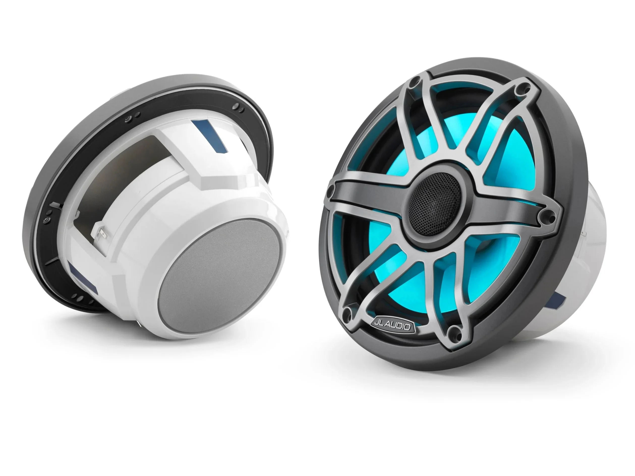 M6 7.7-inch Marine Coaxial Speakers with Transflective™ LED Lighting for Infinite-Baffle Use (100 W, 4 ohms) – Gray Metallic Trim Ring, Titanium Sport Grille