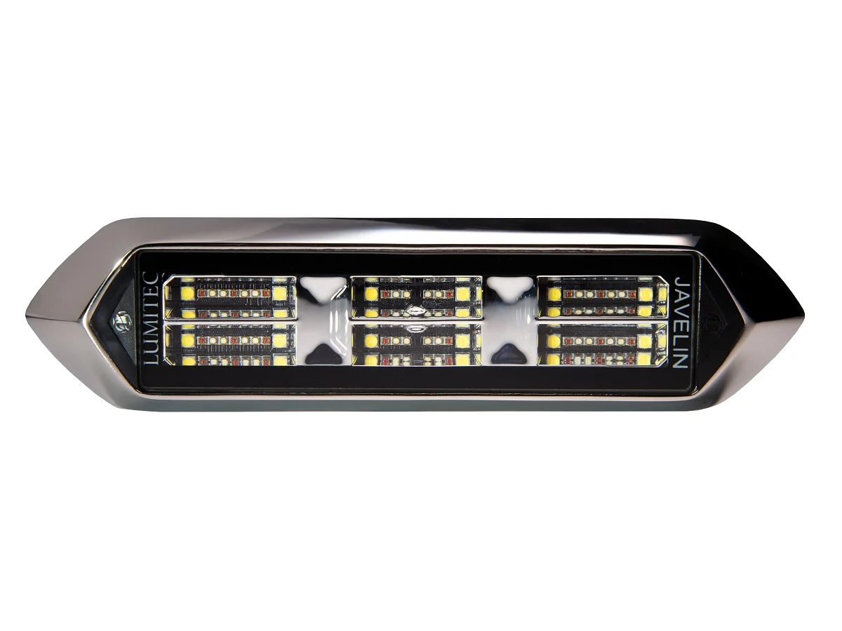 Style and performance unite to create the all-new Javelin Underwater Light Series from Lumitec. Designed for high performance boats the Javelin Underwater Light boasts a highly polished housing and a contemporary stylish rectangular design. Leveraging the same “smart light” technology found in our market-leading SeaBlazeX2 series – Javelin offers the same high performance, full-color RGBW output, simple surface mount installation and the ease of operation only found in Lumitec products. Ideal for fresh water boats of all sizes but durable enough for saltwater applications.