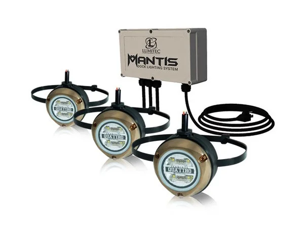 Lumitec’s Mantis Dock Light system leverages the cutting edge Quattro Spectrum underwater light, but adds an innovative Zip-Mount™ universal mounting system and a completely new full-immersion rear seal and wire technology. Lights mount easily to square or round pilings up to 14" in diameter / 12" square — even on pilings with the typical ‘fenders’ above the waterline. Like the SeaBlaze Quattro Spectrum, Mantis’ lights are powerful (2,000+ lumens) and reliable. A typical installation takes less than 90 minutes, and doesn’t even require a permit in many municipalities. Once installed select a mesmerizing full-color RGBW cross fade, bright fish-attracting white, or virtually any user-selected color output. Or add an optional fourth light for even more brilliance. The UL Listed system is powered by an IP68 rated power supply in a durable weatherproof enclosure, and is easily plugged in to any standard outlet for quick and easy DIY installation. All wiring, connectors, mounts, and hardware included. 3 year warranty.