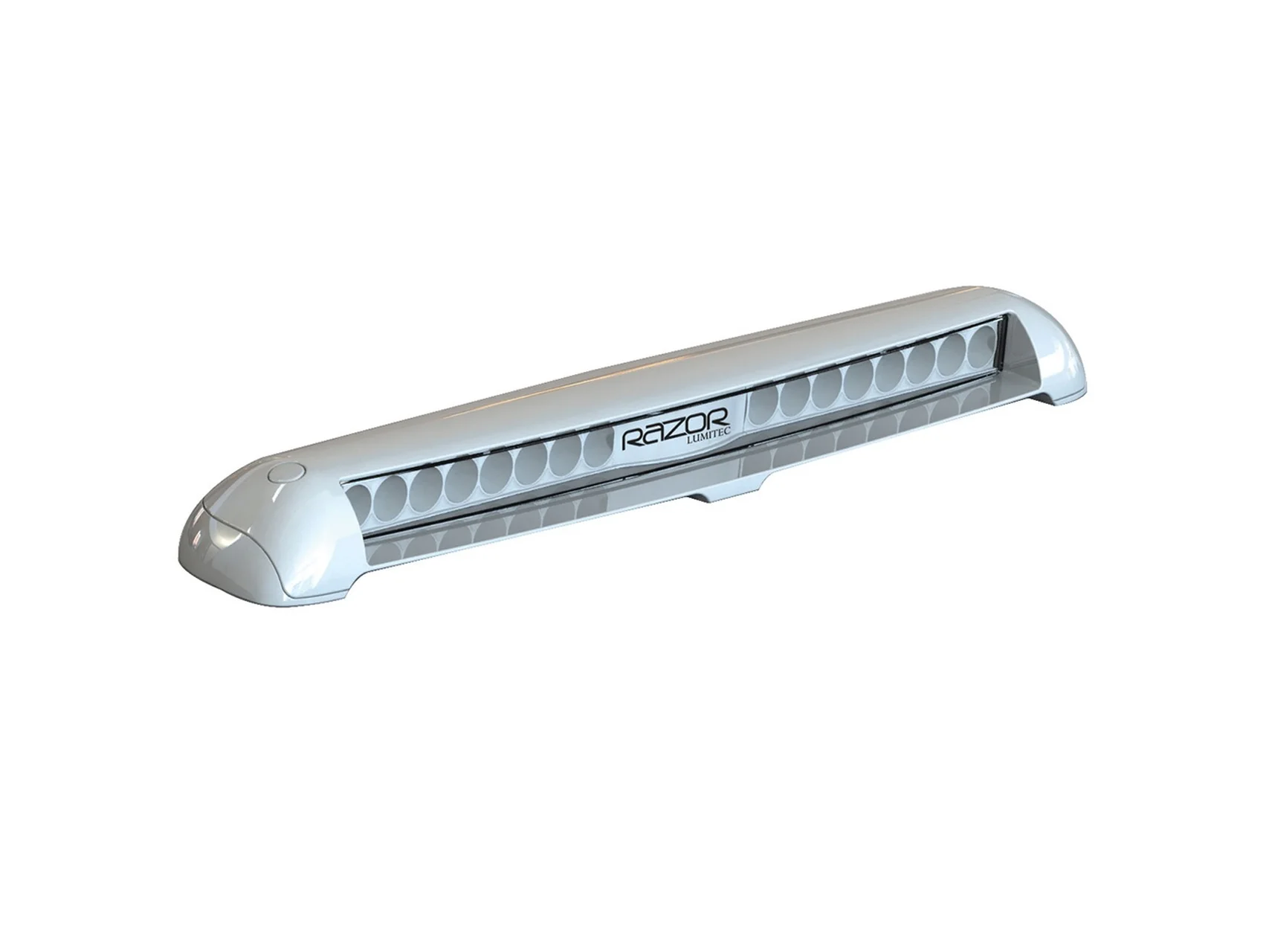Sleek. Streamlined. Powerful. Introducing Razor – The World’s FIRST flush-mount light bar. Razor was carefully designed to be easily integrated into most existing hardtop, arch, and pilothouse designs — typically with only minor modification to production tooling. When mounted facing forward, Razor’s long-throw and high position are invaluable for spotting markers and obstructions. When positioned downward and aft, Razor floods cockpits, gunIn addition to clean lines and a low profile, following Lumitec’s thermally-vetted reference designs allows OEMs to avoid the overheating and subsequent damage to hardtops that can be caused by enclosing other manufacturer’s light bars in a ‘pod’. Razor is also available in a surface-mount configuration, which mounts directly to un-modified hardtop surfaces and allows for an equally clean look and similar thermal performance. Available with two beam patterns (spot or flood) ensures the light goes where you need it most.wales and surrounding areas with more than 10,000 night-piercing lumens.