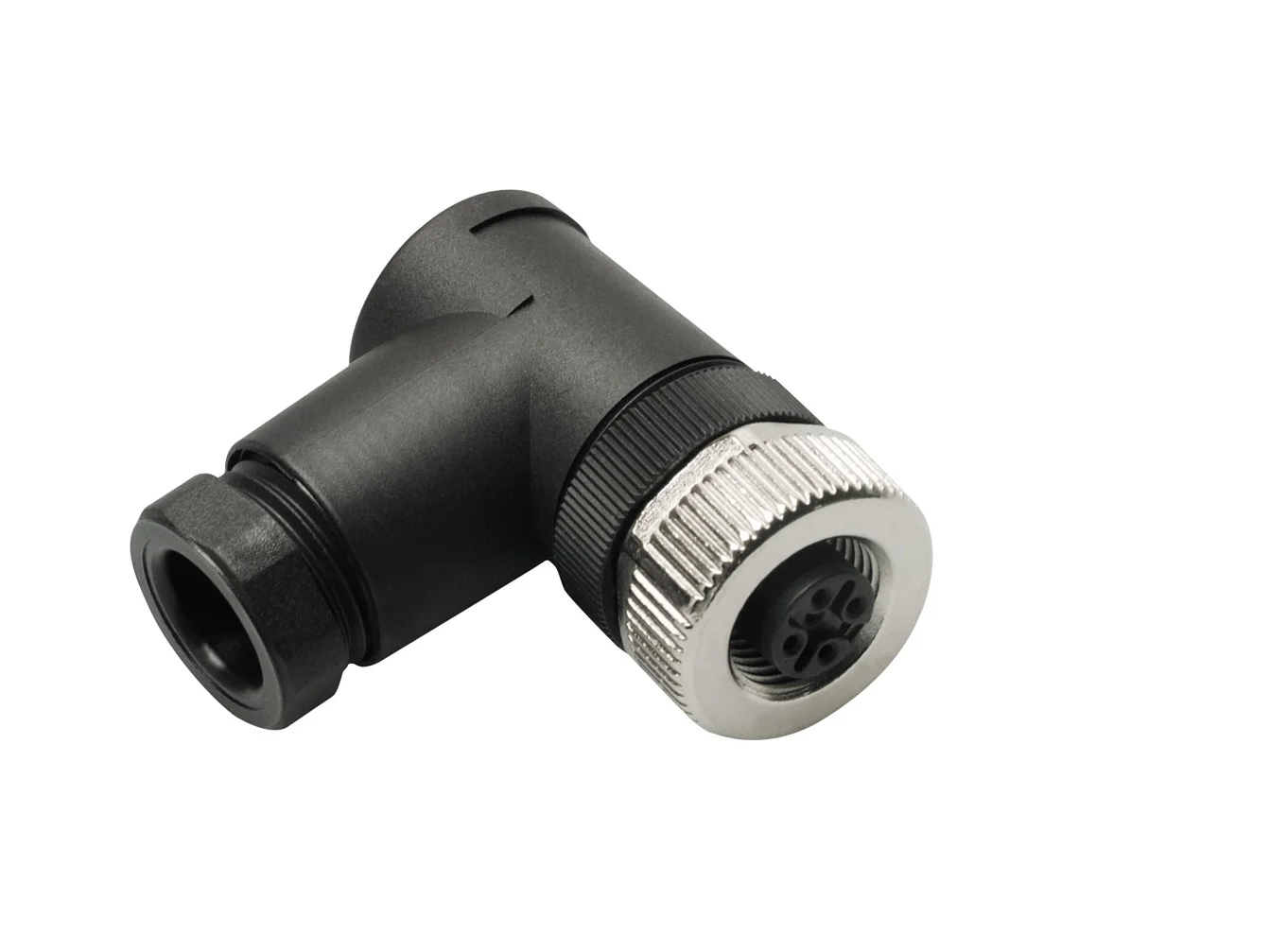 Like the straight Micro/Mid Fieldattachable Connectors, the 90° field attachable connectors allow you to make field connections to bulk cable. The 90° connectors are particularly well suited for tight spaces like the back of displays where there is limited space for a straight connector.