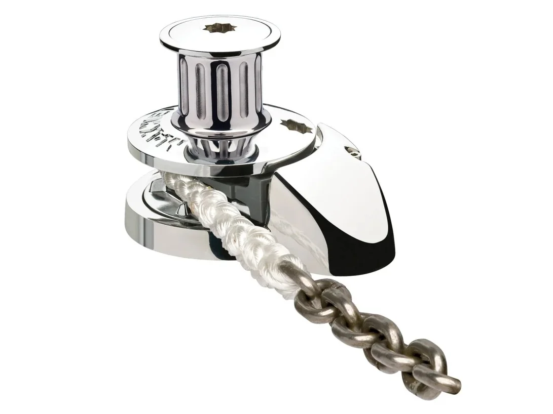 The powerful RC8-8 fully automatic rope/chain windlass can be used with 8 mm (5/16″) chain spliced to 14 mm three strand or 8-plait rope. The ingenious Wave Design™ rope/chain gypsy (chainwheel) is able to accommodate a wide range of chain pitch differences within the specified chain size diameters suitable for use with the RC8 Series. Simple two piece installation saves time and money and allows easy retrofitting without disassembly of the windlass. Unique spacer tube design allows installation through virtually any deck thickness and the multiple mounting positions and self aligning gearbox ensure optimal location of gearbox and motor in virtually all installation situations. The RC8 features Maxwell’s revolutionary and patented, new Wave Design™ chainwheel. The heavy duty stainless steel (AISI 316) pressure arm is designed to effectively help grasp the rope/chain splice, giving the RC8 an unparalleled level of performance. In combination with a heavy duty, large wire diameter, stainless steel preloaded, the pressure arm always exerts maximum control pressure. The RC8 works just as effectively with all-chain rodes. Huge, through deck hawse pipe throat ensures easy entry of the rope/chain rode into and out of the anchor locker. Full disassembly capability of the topworks utilizing only the handle provided and an Allen key. Manual override and ‘Free Fall’, using the emergency crank/clutch handle provided. Sealed oil bath and marine-grade hard anodised, alloy gearbox provides maximum output via a precision worm and worm wheel. Every Maxwell RC8 automatic rope/chain windlass comes with top works, motor/gear box and dual direction solenoid. Switches and circuit breaker are available and need to be ordered separately. Every Maxwell automatic rope/chain windlass is available with all the necessary components for fully automatic dual direction control in a competitively priced package. This windlass is also available in a version with extra deck clearance. Contact your dealer for more information. Important: Maxwell windlasses must be used in conjunction with a chain stopper and/or alternative snubbing device to take the load off the windlass while laying at anchor. The chain stopper and alternative snubbing system should also be used to secure the anchor in the fully raised position while under way.