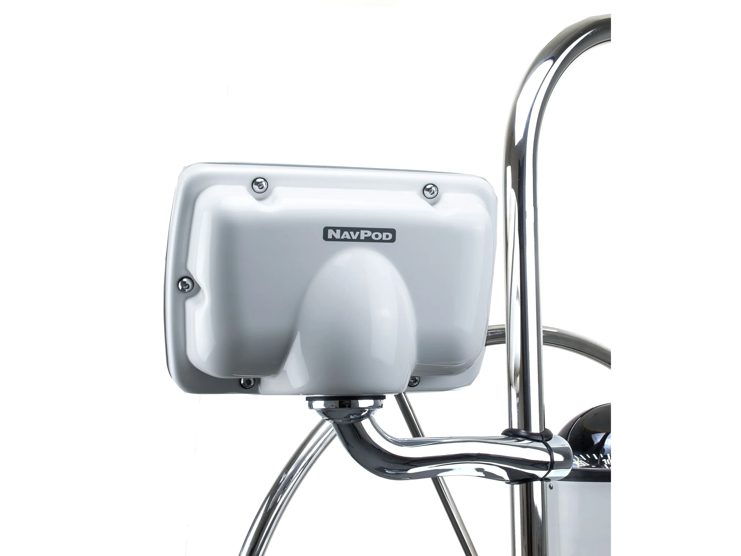 RailMount NavPods are best used for mounting of an autopilot control, sailing instrument, or small chartplotter onto an existing pedestal guard. Fits onto any 1" or 1.25" diameter tube. A Nickel Chrome-Plated Stainless Steel arm is used to mount a NavPod. The NavPod can rotate 180 degrees for easy viewing while sitting under the dodger on a rainy day. All wiring runs from the NavPod, down the center of the stainless steel arm, and into the pedestal guard. This application provides a clean and sturdy installation for electronics, without replacement of the pedestal guard.