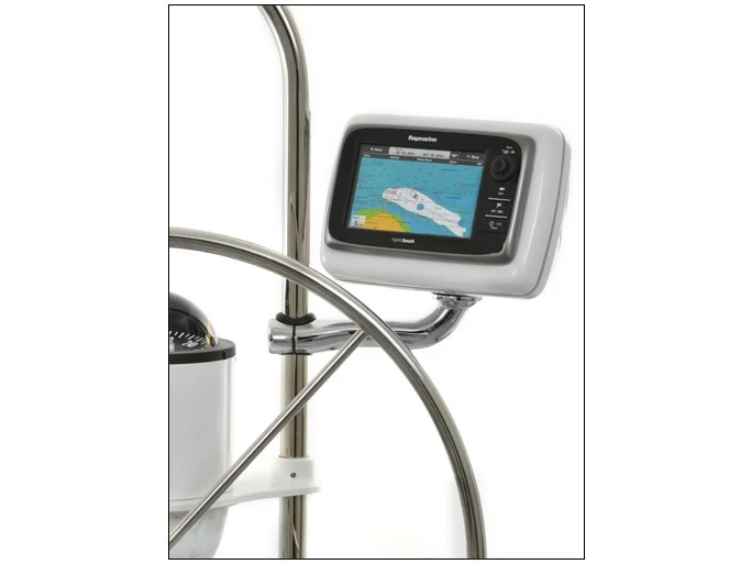 RailMount NavPods are best used for mounting of an autopilot control, sailing instrument, or small chartplotter onto an existing pedestal guard. Fits onto any 1" or 1.25" diameter tube. A Chromed Stainless Steel arm is used to mount a NavPod. The NavPod can rotate 180 degrees for easy viewing while sitting under the dodger on a rainy day. All wire run from the NavPod, down the center of the stainless steel arm, and into the pedestal guard. This application provides a clean and sturdy installation for electronics, without replacement of the pedestal guard.