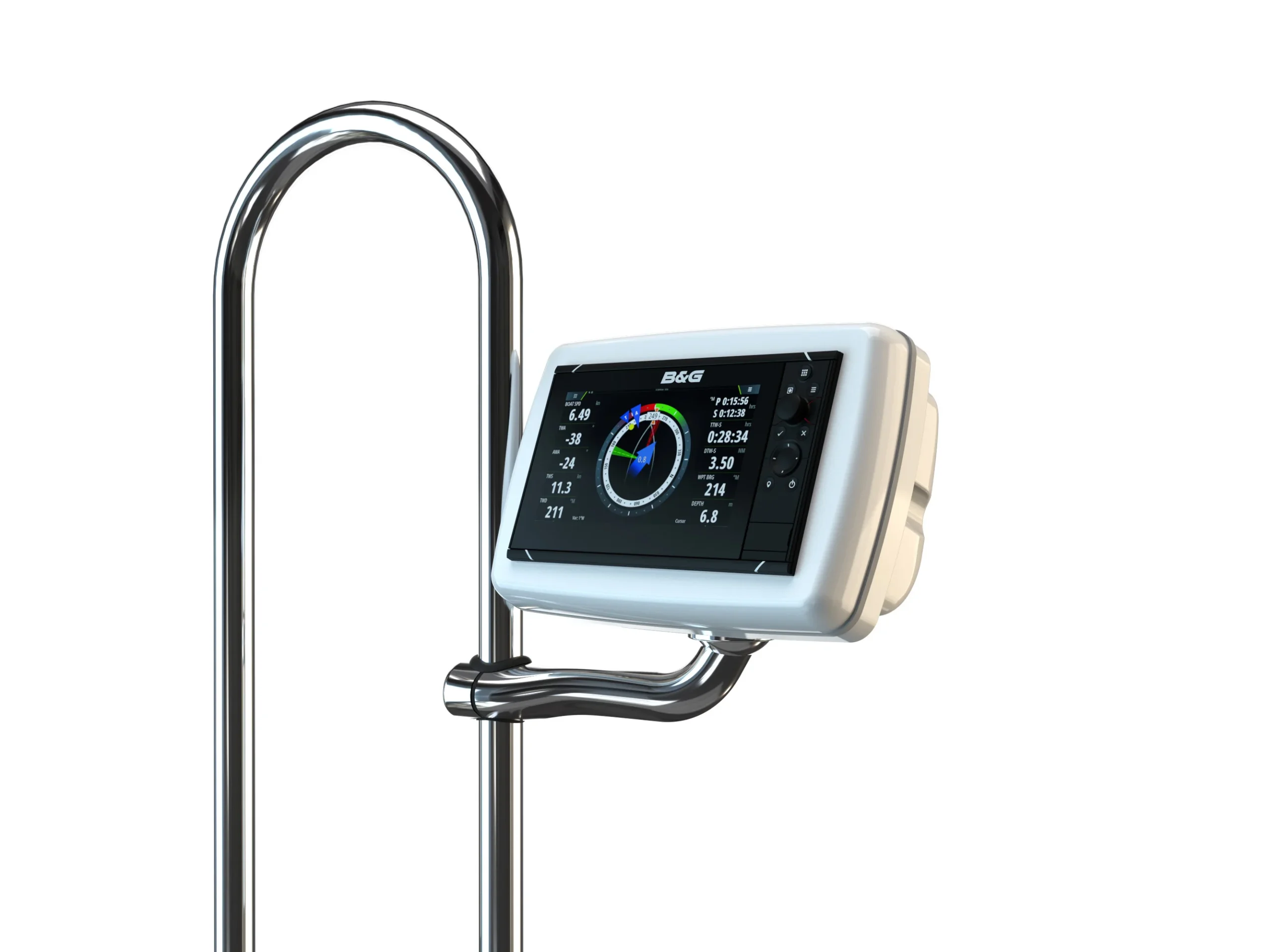 RailMount NavPods are best used for mounting of an autopilot control, sailing instrument, or small chartplotter onto an existing pedestal guard. Fits onto any 1" or 1.25" diameter tube. A Nickel Chrome-Plated Stainless Steel arm is used to mount a NavPod. The NavPod can rotate 180 degrees for easy viewing while sitting under the dodger on a rainy day. All wiring runs from the NavPod, down the center of the stainless steel arm, and into the pedestal guard. This application provides a clean and sturdy installation for electronics, without replacement of the pedestal guard.