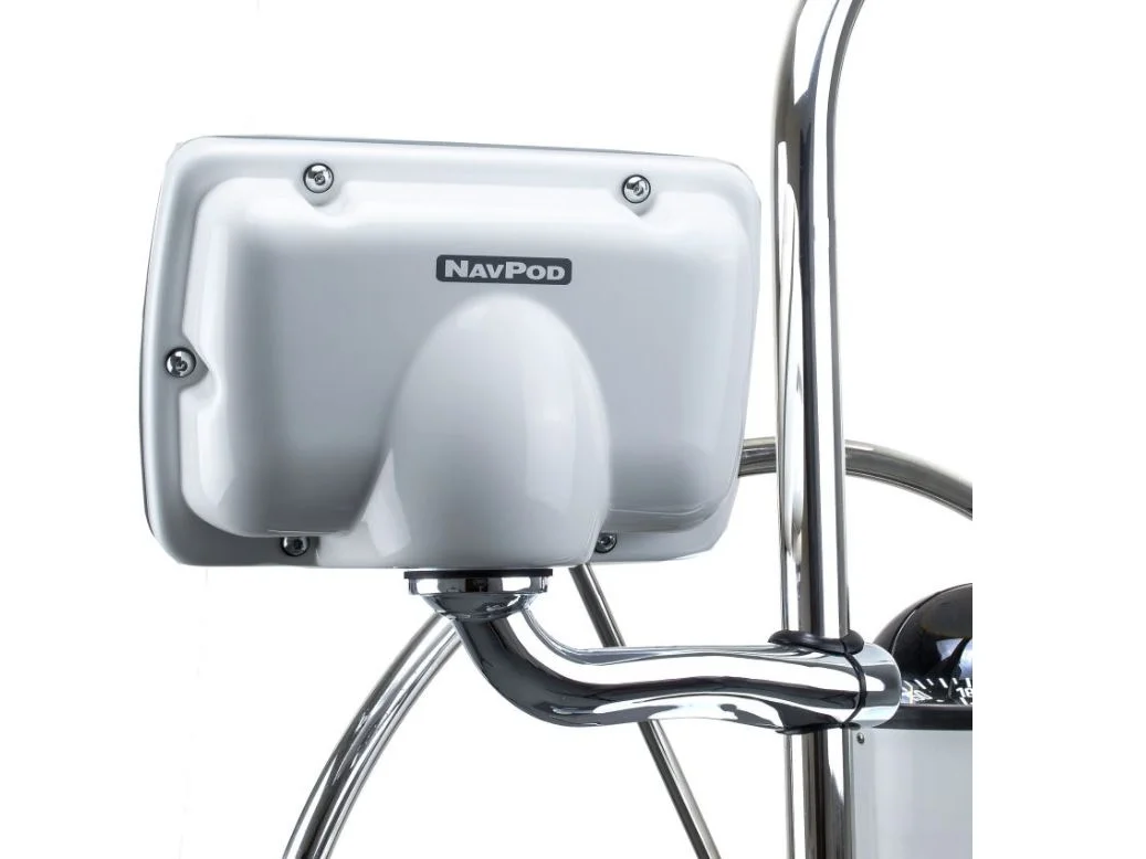 RailMount NavPods are best used for mounting of an autopilot control, sailing instrument, or small chartplotter onto an existing pedestal guard. Fits onto any 1" or 1.25" diameter tube. A Nickel Chrome-Plated Stainless Steel arm is used to mount a NavPod. The NavPod can rotate 180 degrees for easy viewing while sitting under the dodger on a rainy day. All wiring runs from the NavPod, down the center of the stainless steel arm, and into the pedestal guard. This application provides a clean and sturdy installation for electronics, without replacement of the pedestal guard.