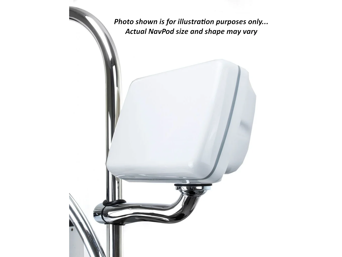 RailMount NavPods are best used for mounting of an autopilot control, sailing instrument, or small chartplotter onto an existing pedestal guard. Fits onto any 1" or 1.25" diameter tube. A Nickel Chrome-Plated Stainless Steel arm is used to mount a NavPod. The NavPod can rotate 180 degrees for easy viewing while sitting under the dodger on a rainy day. All wiring runs from the NavPod, down the center of the stainless steel arm, and into the pedestal guard. This application provides a clean and sturdy installation for electronics, without replacement of the pedestal guard.