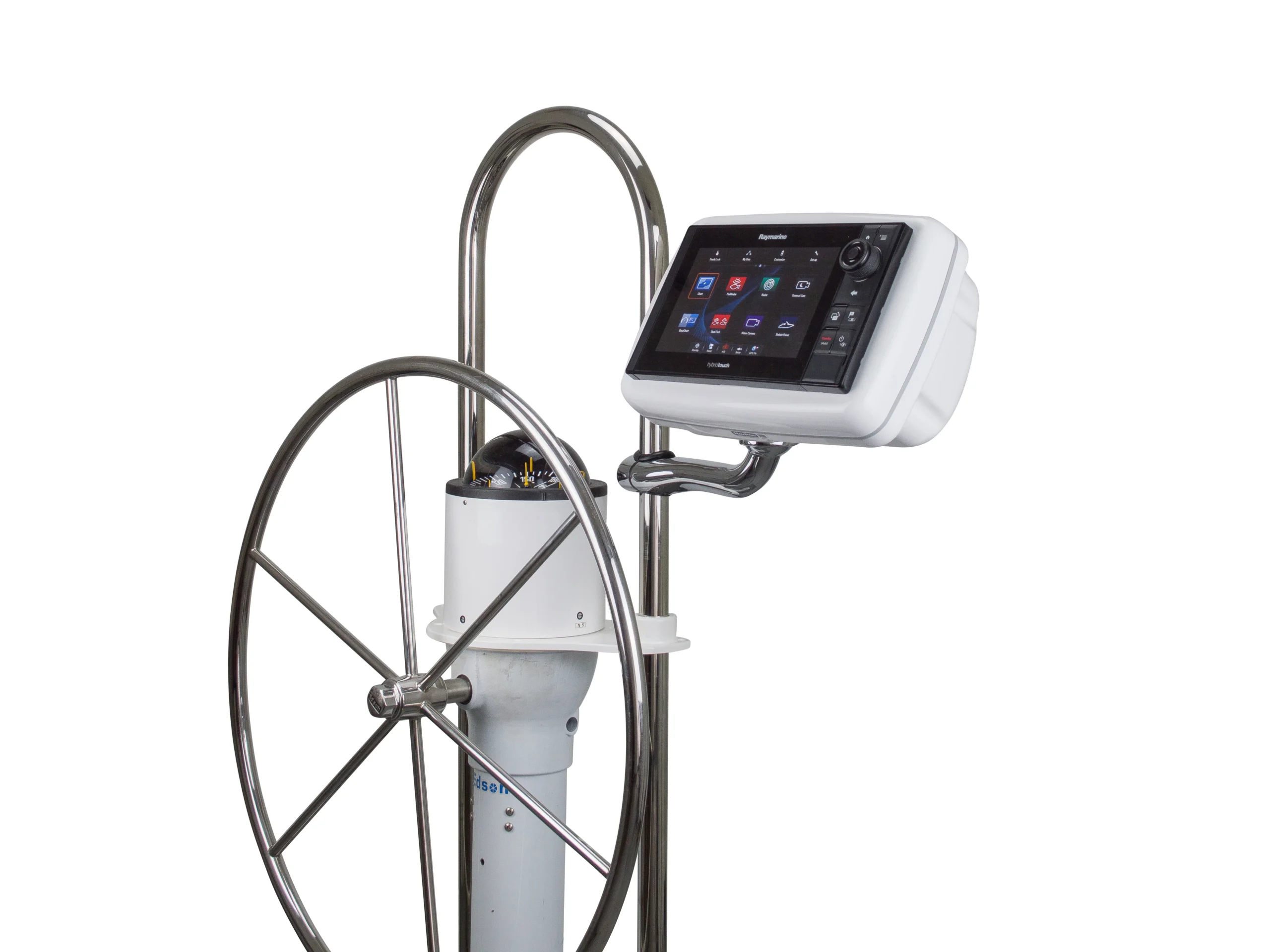 RailMount NavPods are best used for mounting of an autopilot control, sailing instrument, or small chartplotter onto an existing pedestal guard. Fits onto any 1" or 1.25" diameter tube. A Nickel Chrome-Plated Stainless Steel arm is used to mount a NavPod. The NavPod can rotate 180 degrees for easy viewing while sitting under the dodger on a rainy day. All wiring runs from the NavPod, down the center of the stainless steel arm, and into the pedestal guard. This application provides a clean and sturdy installation for electronics, without replacement of the pedestal guard.