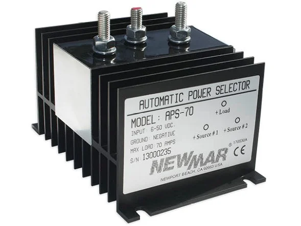 The Automatic Power Selector (APS) is a solid state device which enables installation of a seamless, redundant power system for critical electronic loads. It selects the higher voltage of two independent DC power sources and routes power to the load. Should one source falter or fail, the other will automatically supply the load with no transfer delay, operation continues uninterrupted.