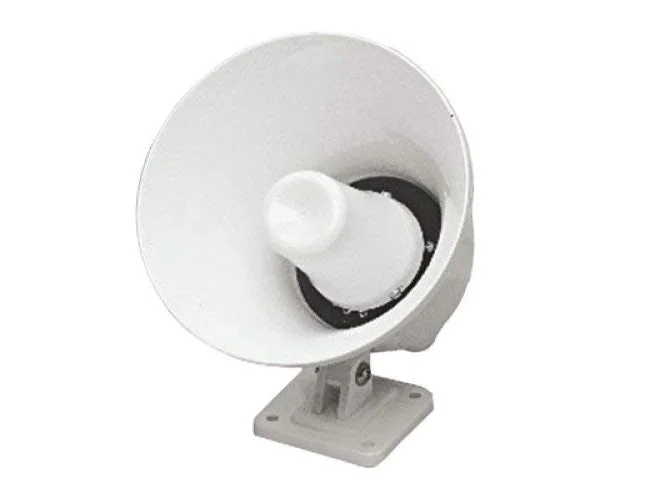 Clear, distortion free, waterproof deck horns are ideal for shipboard paging, hailing, fog horn and alarm systems. High impact plastic construction and assembled with stainless steel hardware. 8 Ohm.