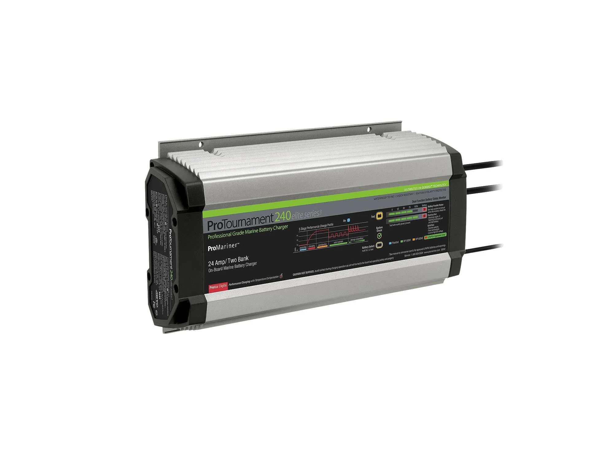 Full output 5-stage digital performance charging to charge, condition, auto maintain and storage recondition your batteries once a month, maximizing battery life and performance. 100% charging performance with AC voltage as low as 90 VAC. System Check OK and Check Battery indicators, Charge Mode LEDs and a dual mode battery status monitor displaying charge progress or on the water power remaining. User selectable charging profiles for Flooded, AGM and ProMariner approved LiFePO4 chemistries.