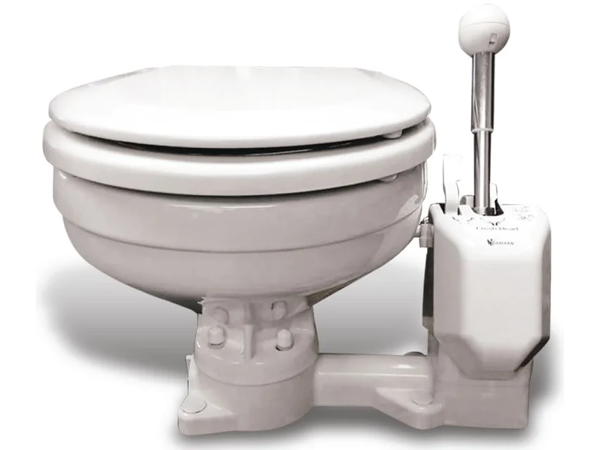 • The first manual marine toilet to utilize pressurized fresh water — eliminates calcium deposits in discharge hose