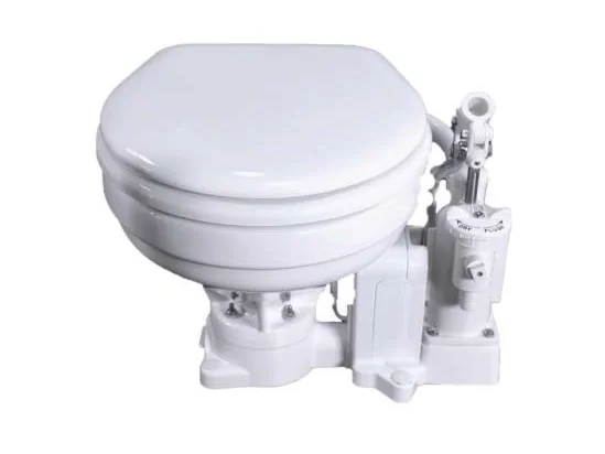 The air vent added on in the 1980’s allows the user to close the intake water while still pumping and prevents pressure build-up. Being able to flush the toilet without adding water has many benefits including the ability to empty out the bowl while in heavy seas. Each unit comes with a slow close seat that include stops on the underside of the seat to help prevent the seat from shifting while in use in heavy seas.